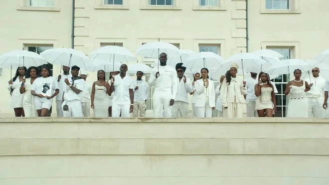 Image shows Black British icons dressed in white holding white umbrellas.